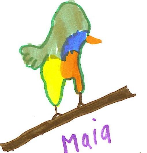 I have a 6-year old friend named Maia. I have been trying to interest her in birds. I found a nest in the woods and put it in a fruit cake can and gave it to her. Later I found some old dried out but still lustrous eggs and we added those to the nest. She is learning how to use binoculars. Last year we saw a yellow-crowned heron in Sligo Creek Park. Maia has a taste for beauty and bright colors and is showing some artistic talent. Here is one of her recent pieces: